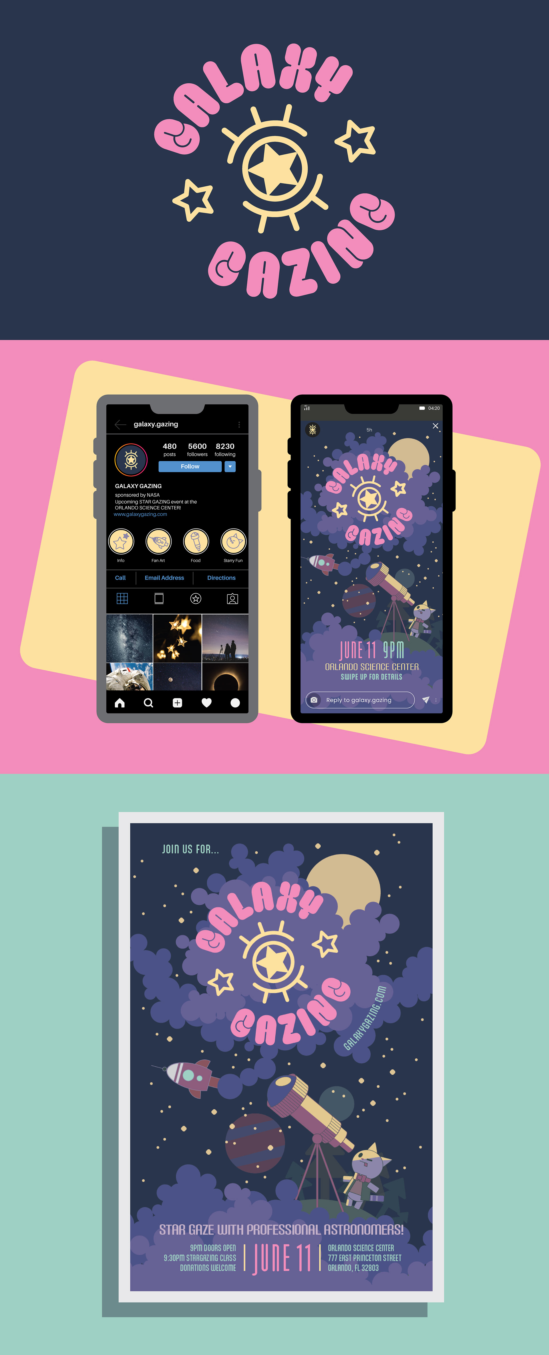 A conceptual event branding project celebrating astronomical curiosities. Galaxy Gazing was designed as a fictional stargazing event sponsored by NASA, featuring a cohesive visual identity across poster and social media platforms. This playful, retro-inspired design combines soft pastel tones and whimsical illustrations to evoke curiosity and childlike wonder about the cosmos.